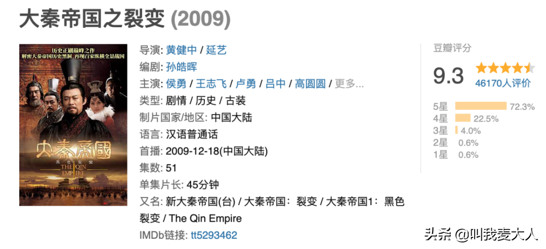 开头的豆瓣评分8.9,与大秦帝国第一、第二部的评分9.3,相差无几。